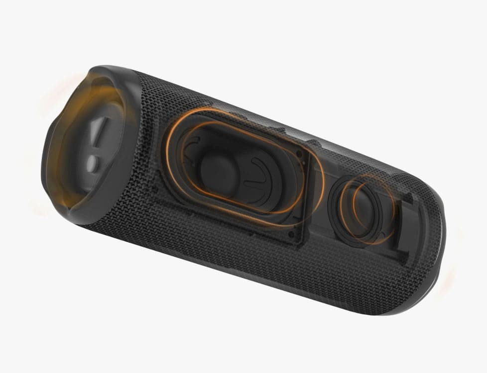 Чтобы добиться как можно более качественного звука, в JBL Flip 6 используются широкополосный динамик в форме суперэллипса и пара пассивных излучателей — они гарантируют исключительные бас и середину. Также предусмотрен отдельный высокочастотный динамик для предельно чётких высоких частот.