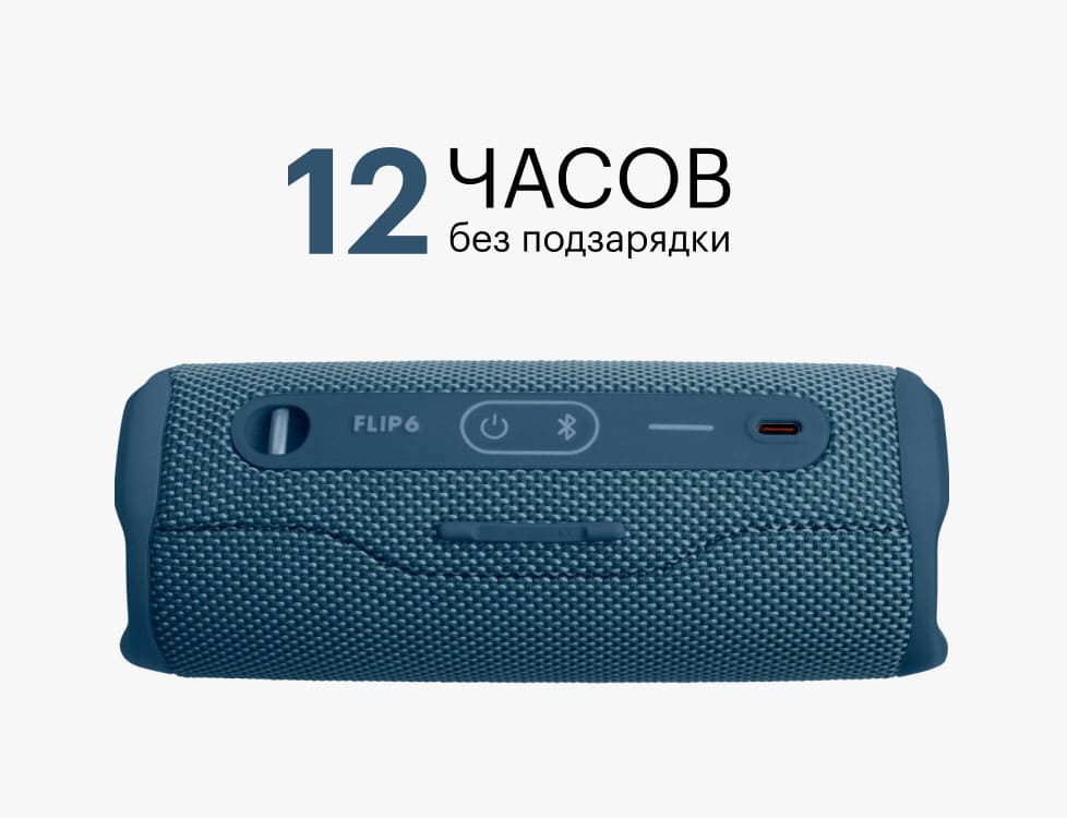 Время автономной работы JBL Flip 6 на одном заряде аккумулятора достигает 12 часов — этого окажется более чем достаточно даже для самой продолжительной вылазки на свежий воздух. Более того, колонку получится запитать не только от сети, но и от пауэрбанка, что также может пригодиться.